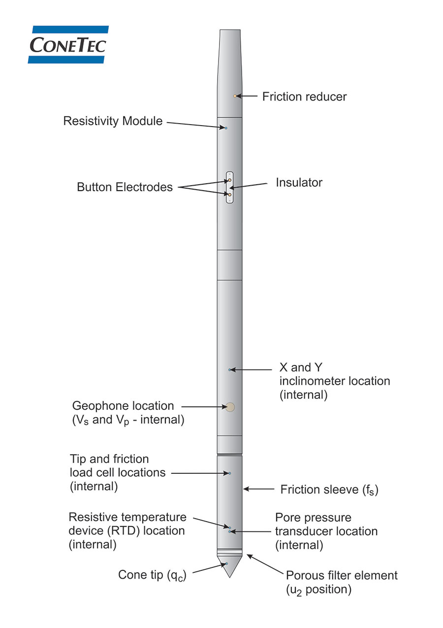 El ensayo de penetración con cono de resistividad/conductividad (RCPTu) combina la medición de la resistividad/conductividad del suelo (1/conductividad) y las capacidades de registro de datos del ensayo de penetración con cono (CPTu o SCPTu). El RCPTu representa una manera rápida, fiable y económica de determinar las propiedades del suelo además de proporcionar mediciones relativas de resistividad/conductividad eléctrica.