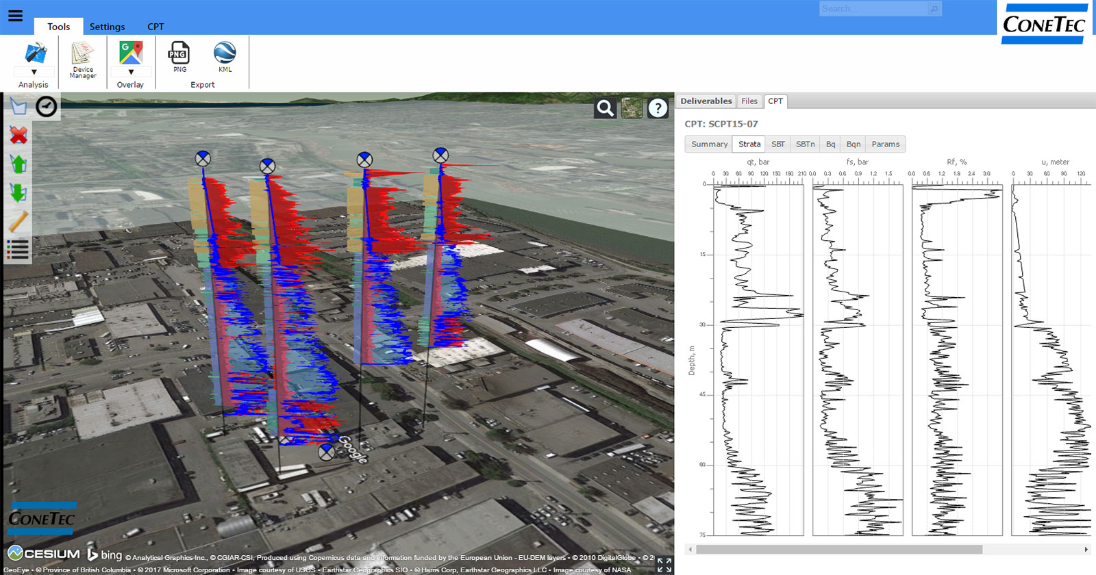 - Prise en charge des CPTu standard, sismique, gamma, résistivité et UVIF, du pénétromètre à plein débit (BCPTu), des échantillons de laboratoire, des tests de gradation en laboratoire, des essais de cisaillement sur le terrain et électronique, des données de vitesse de cisaillement et de compression et des types de données génériques