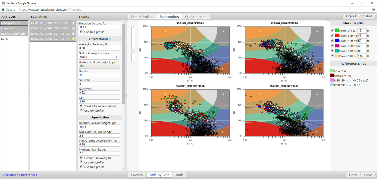 - Analyse de liquéfaction cyclique et statique et une large gamme de paramètres CPT calculés
